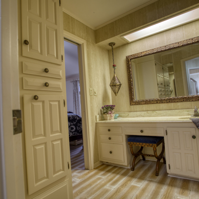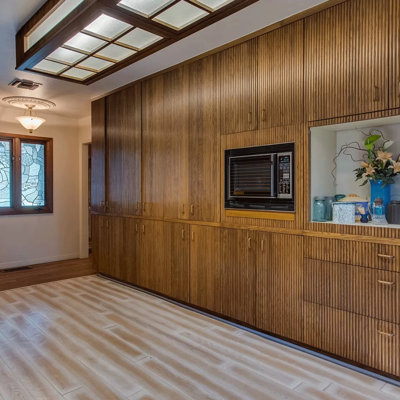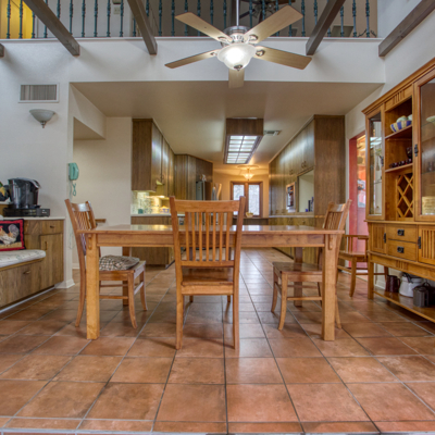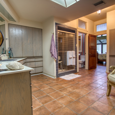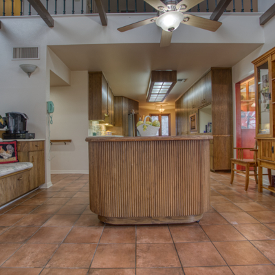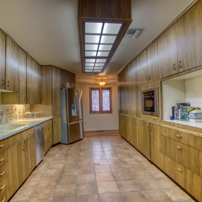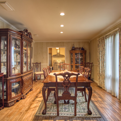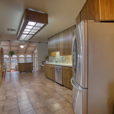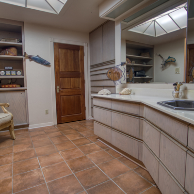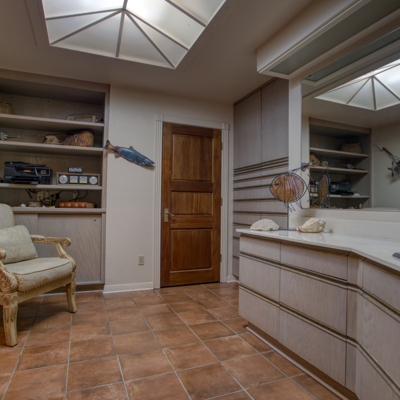 The spacious kitchen has contemporary rounded teak wood, floor to ceiling cabinets with matching rolling serving cart, stainless steel appliances and electric in floor for an island. Large breakfast area has views of the solarium and patio. A very large formal dining room off the kitchen rounds out the downstairs area.